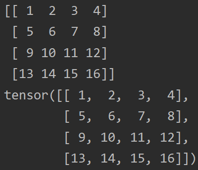 | tensor1 = torch.tensor(list1) print(array1) print(tensor1)